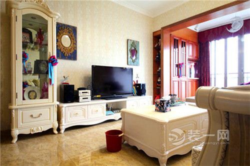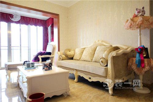 米色主调嵌入窗帘紫红色的元素,搭配欧式家具,典雅端庄。沙发旁落地灯上的面具装饰表现出一种假面舞会后的欢庆,让客厅气氛都欢腾起来。